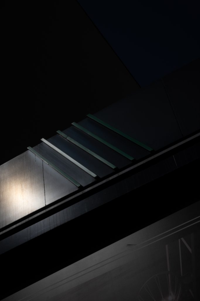 Through radical framing and the use of obstructions, the environment fractures into autonomous fragments. Stripped of context, scale, and perspective, structures of concrete, metal, and light close in on themselves, demonstrating resistance to the observer’s gaze.